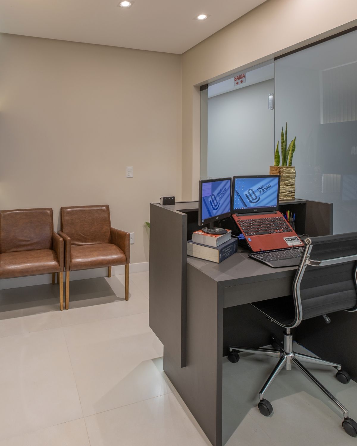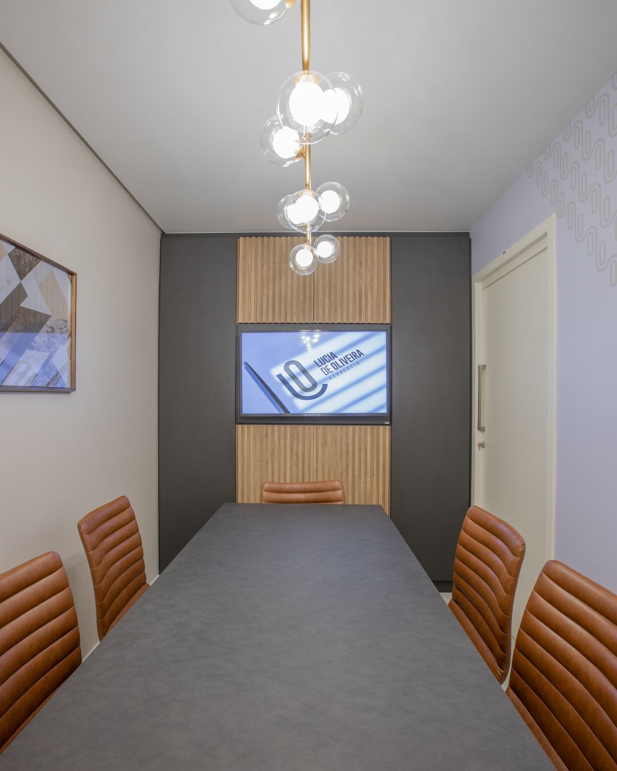 Neste projeto de escritório de advocacia de apenas 37,00 m² tínhamos o desafio de adequar 4 salas de trabalho: recepção, sala advogados associados, reuniões, sala da advogada além da copa e lavabo.