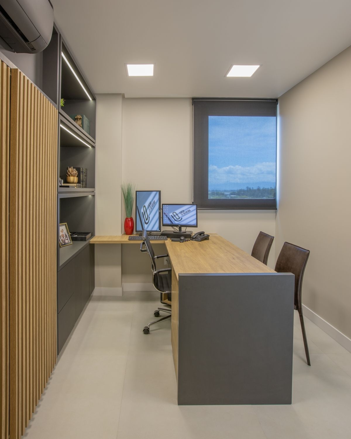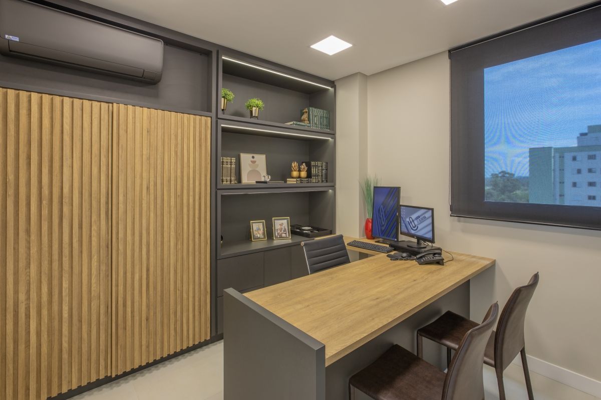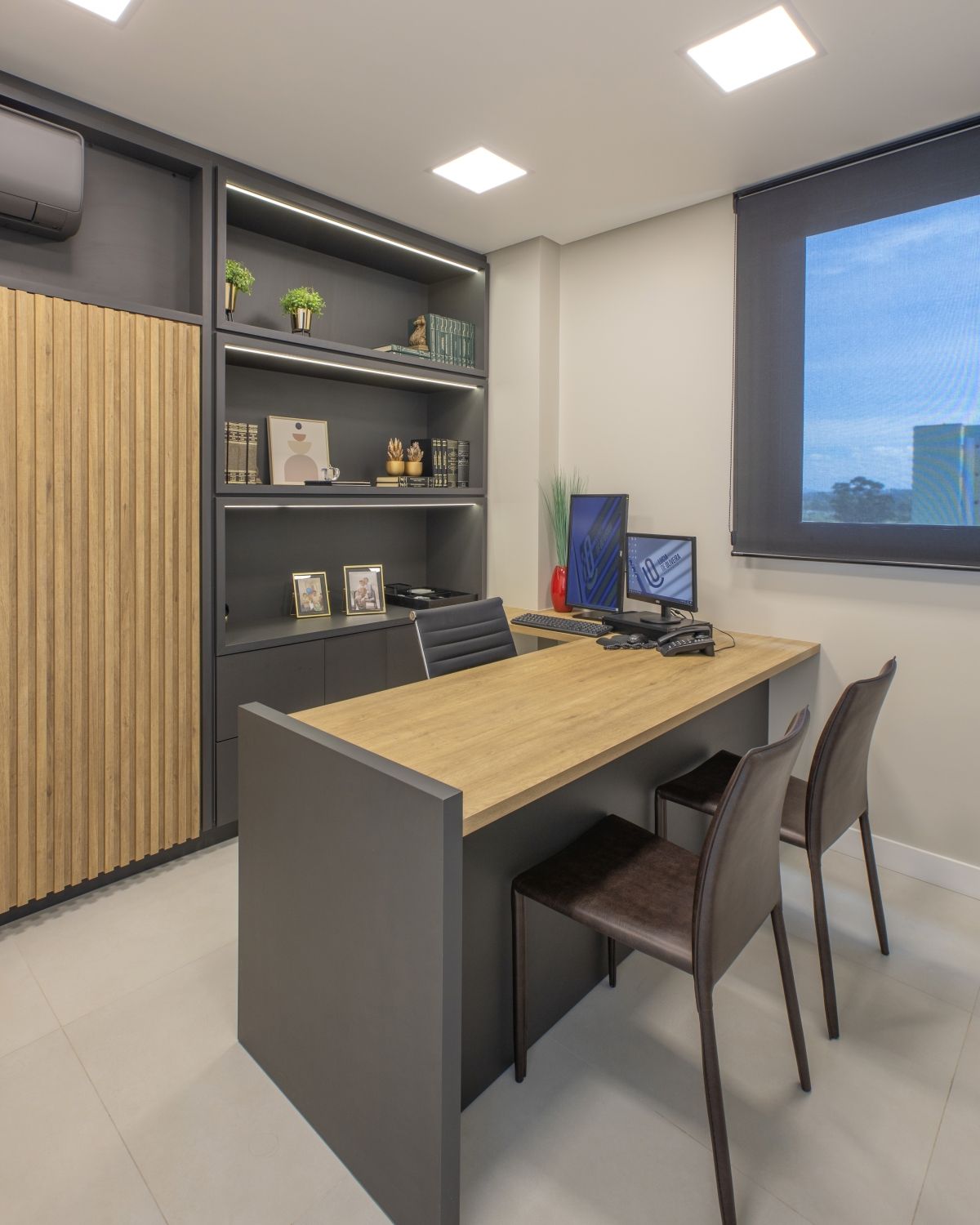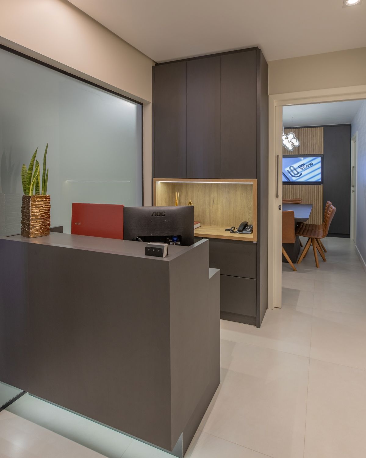 Após essas definições, o pedido era trazer um tom de seriedade e ao mesmo tempo aconchego, para isso foram definidos móveis na cor cinza escuro e amadeirados. Utilizamos o painel ripado amadeirado dando a mesma identidade e continuidade aos ambientes.