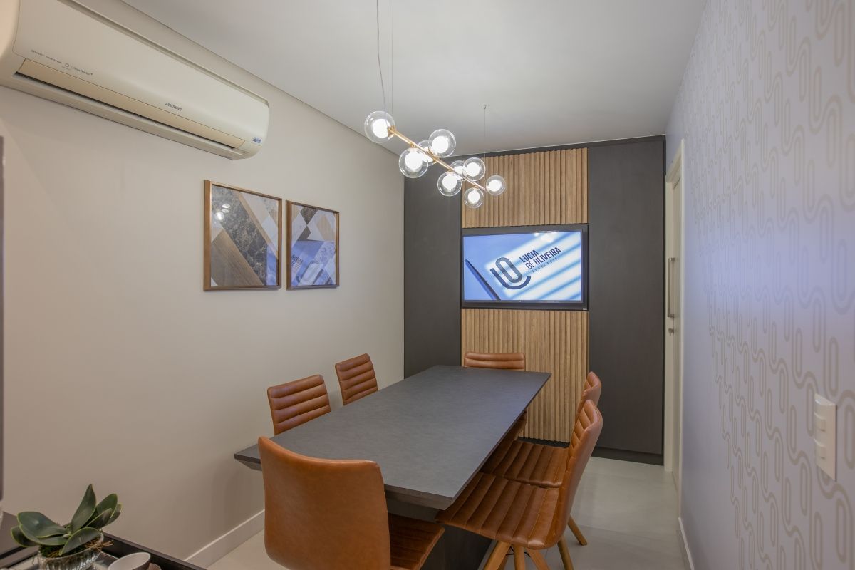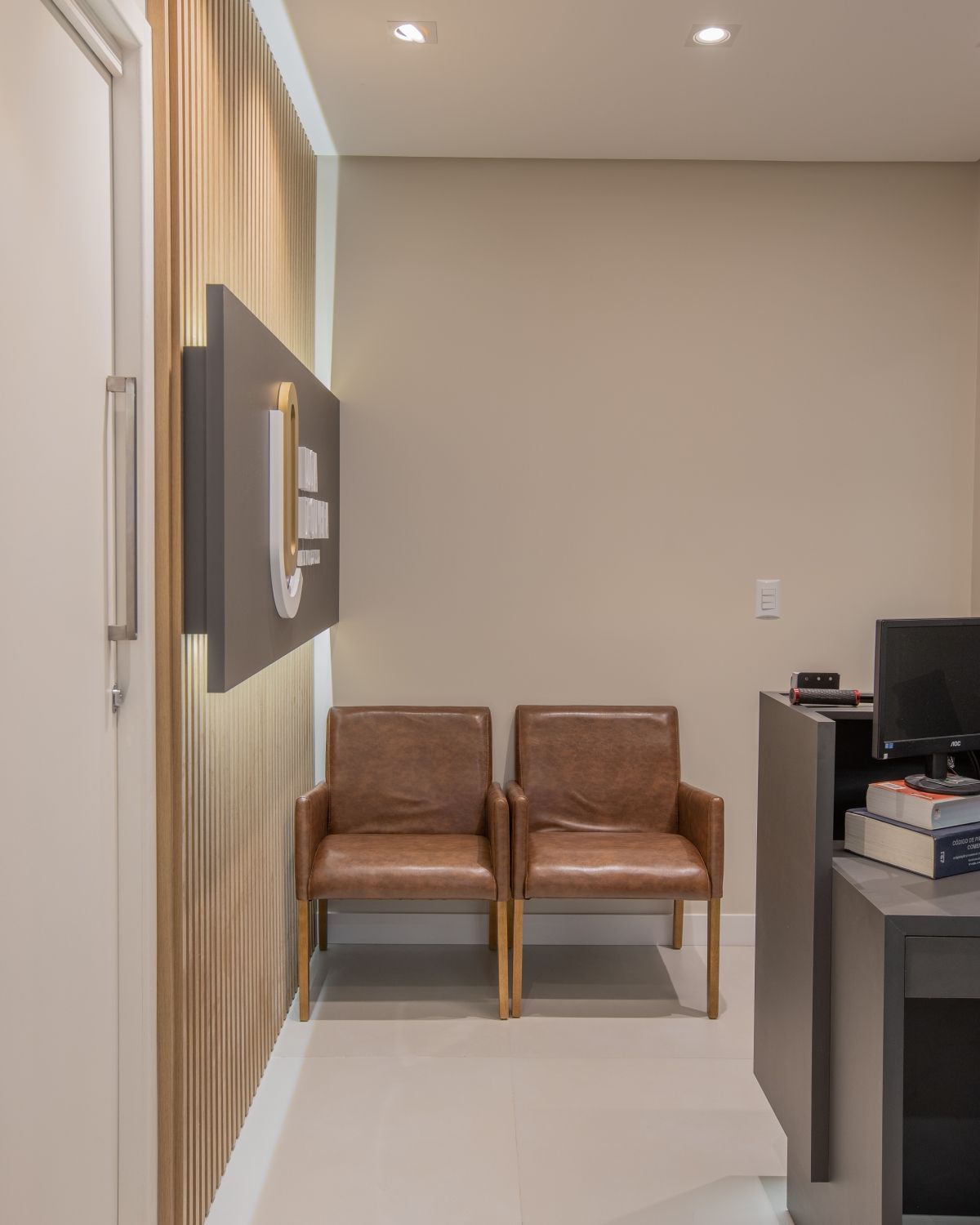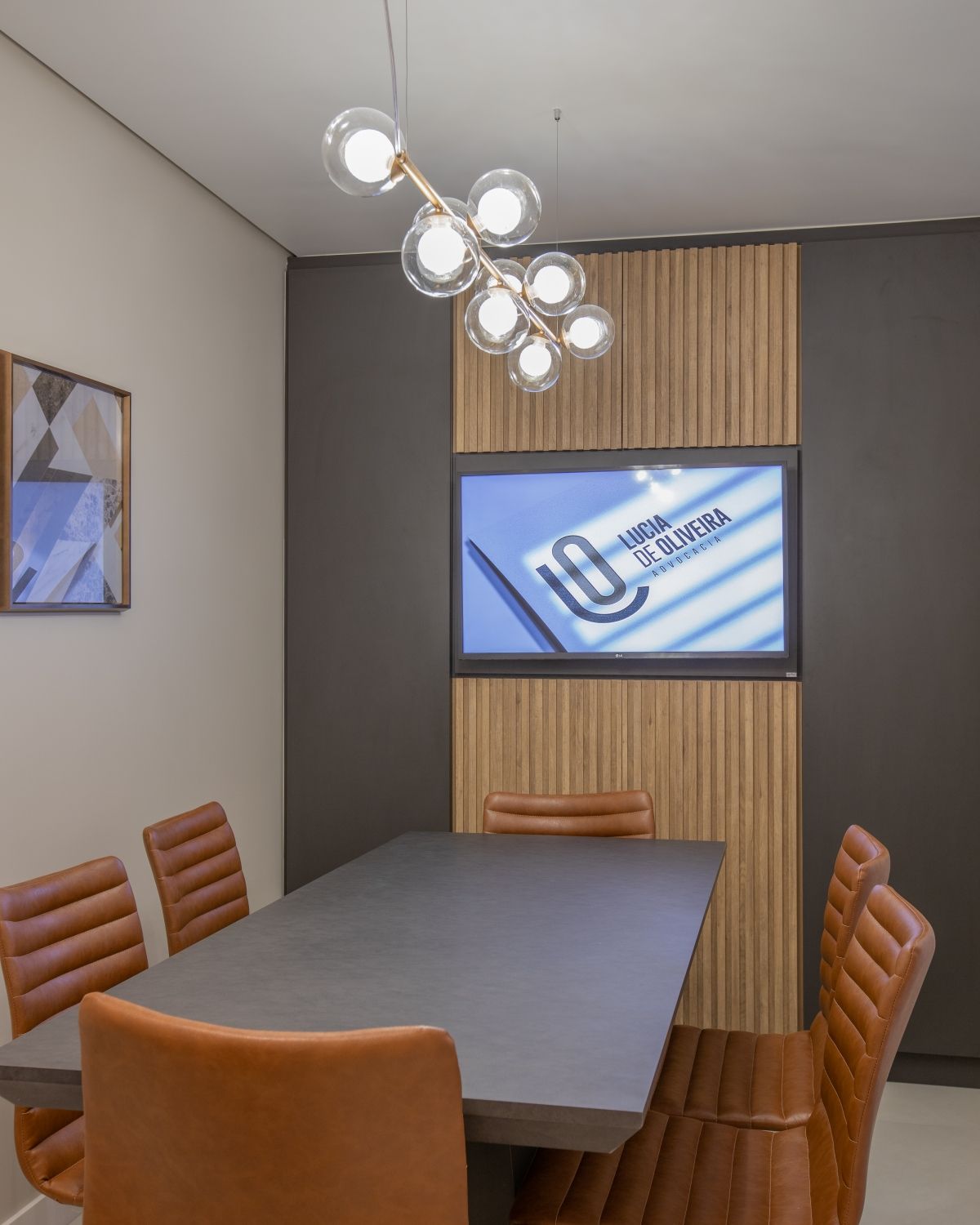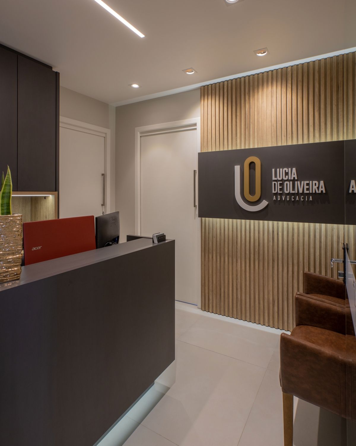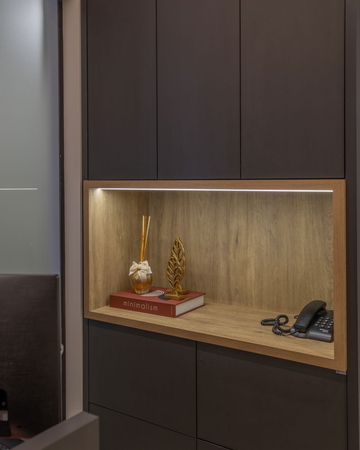 Após essas definições, o pedido era trazer um tom de seriedade e ao mesmo tempo aconchego, para isso foram definidos móveis na cor cinza escuro e amadeirados. Utilizamos o painel ripado amadeirado dando a mesma identidade e continuidade aos ambientes.