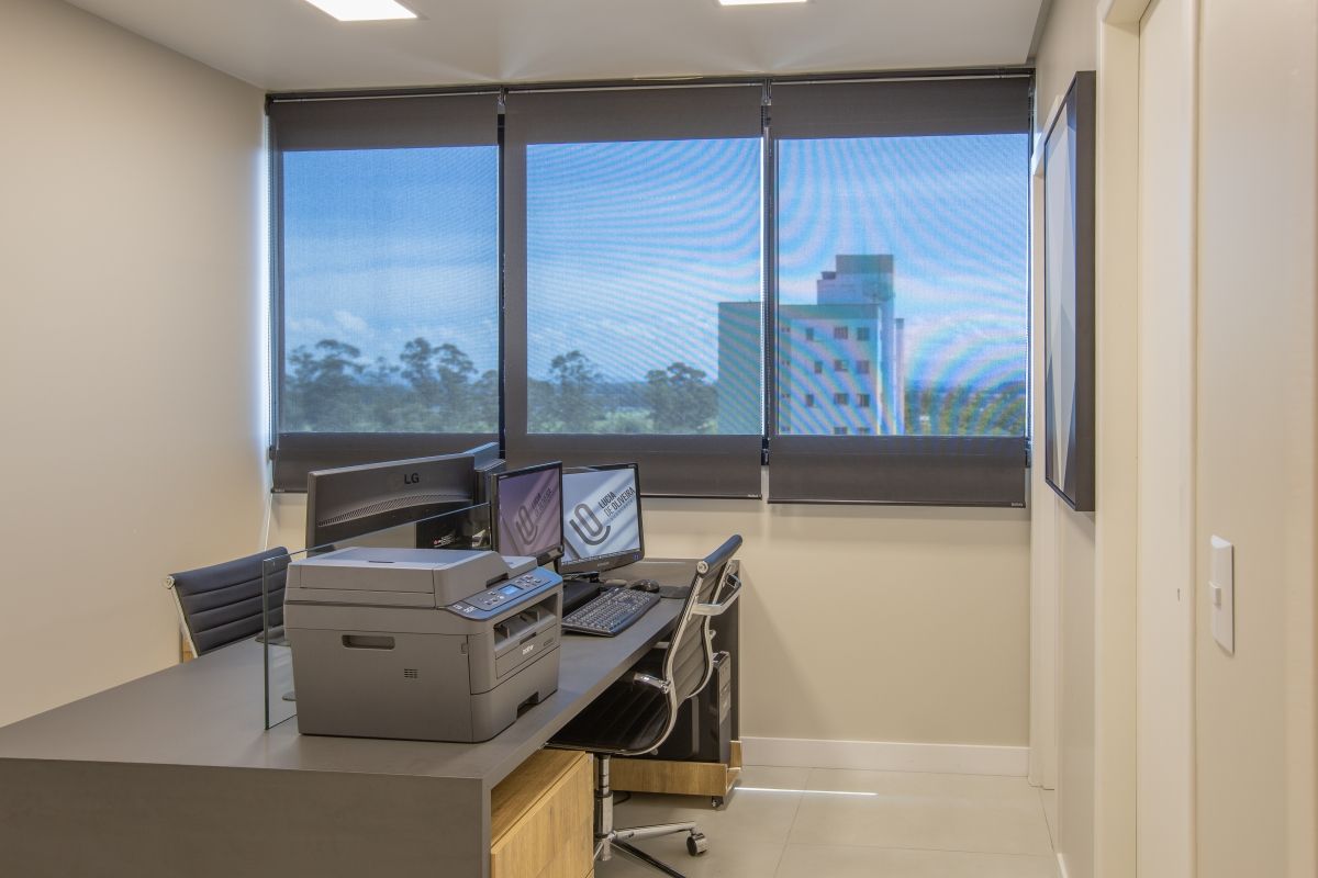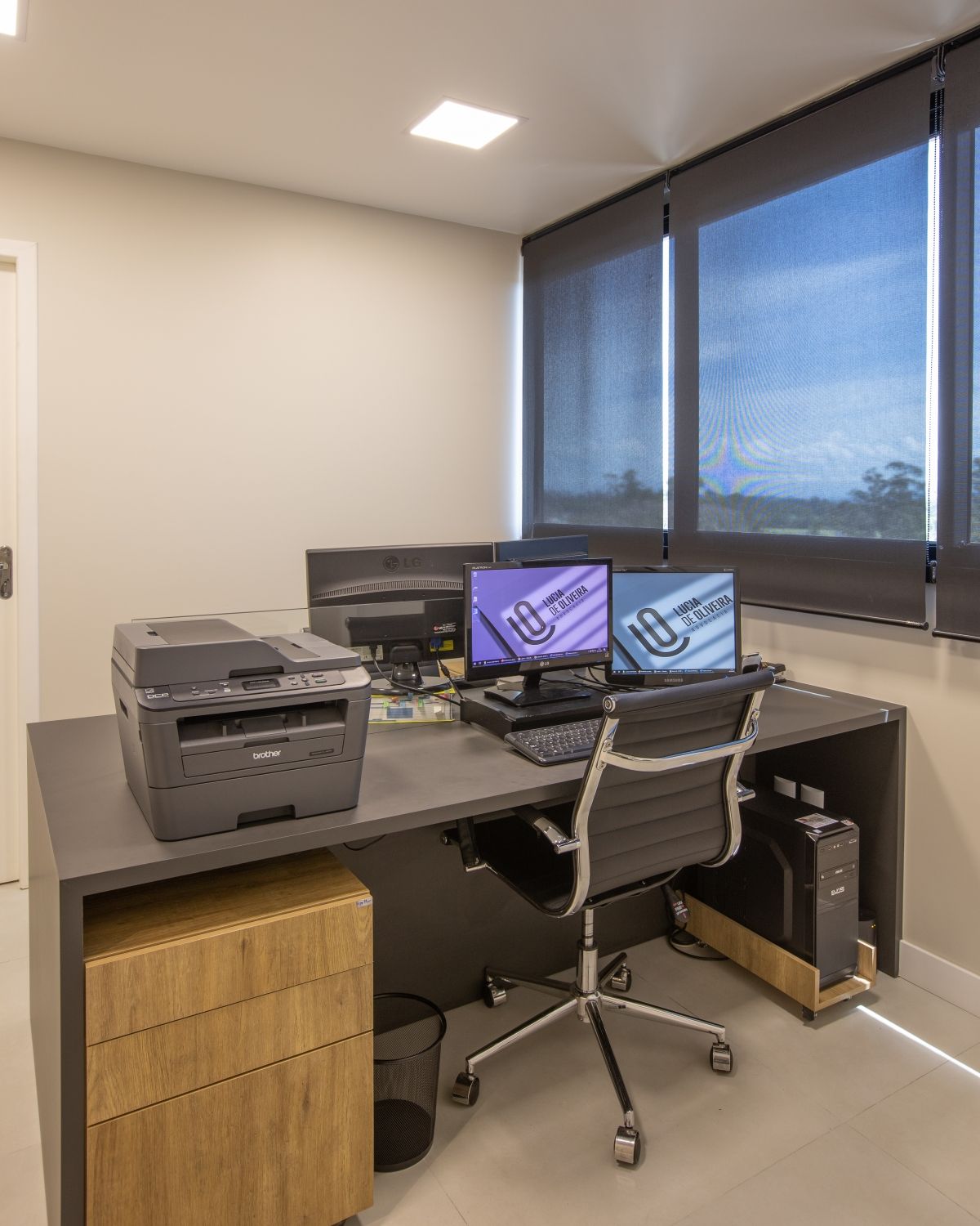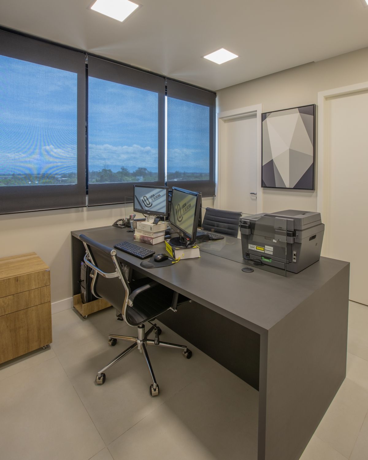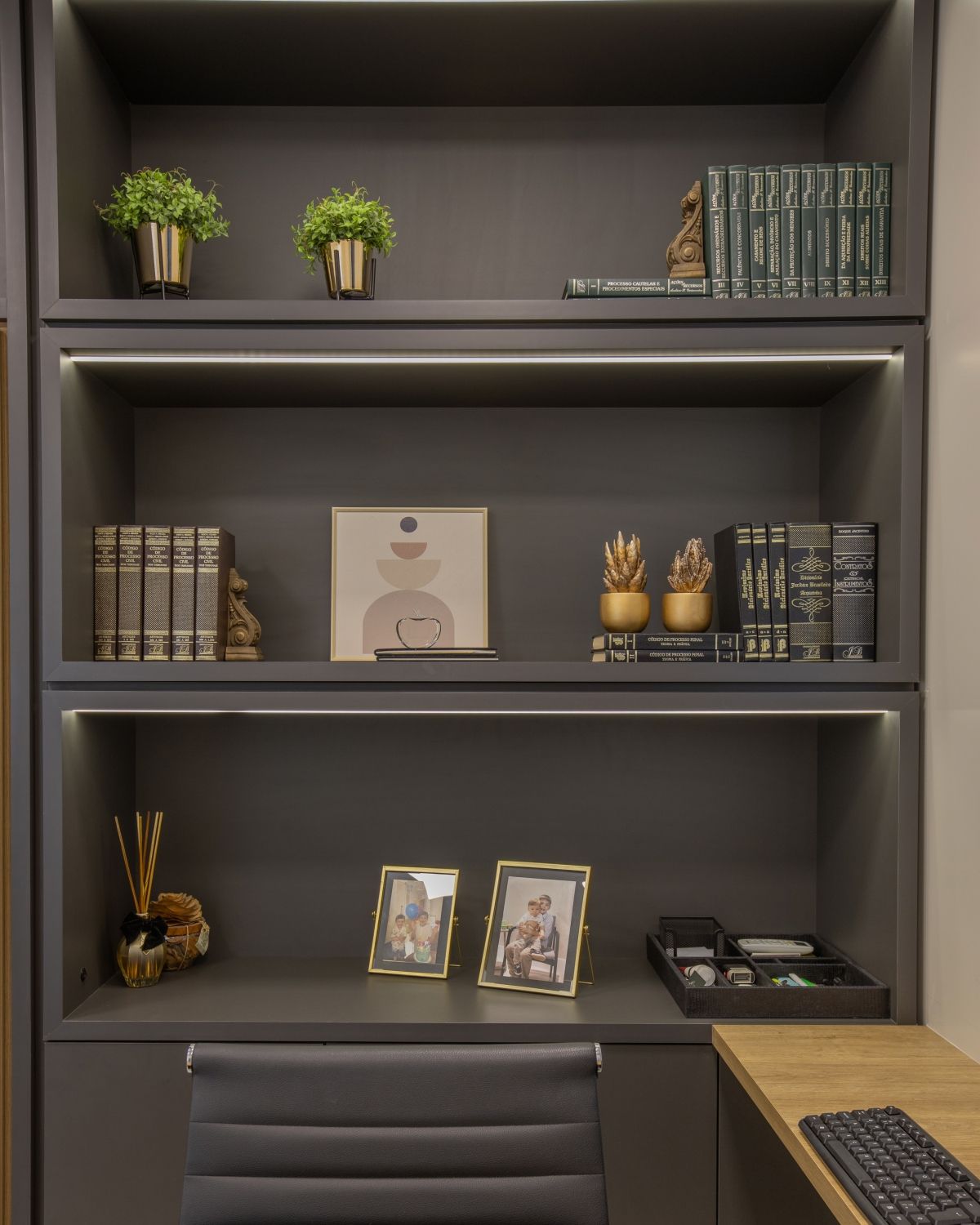 Após essas definições, o pedido era trazer um tom de seriedade e ao mesmo tempo aconchego, para isso foram definidos móveis na cor cinza escuro e amadeirados. Utilizamos o painel ripado amadeirado dando a mesma identidade e continuidade aos ambientes.