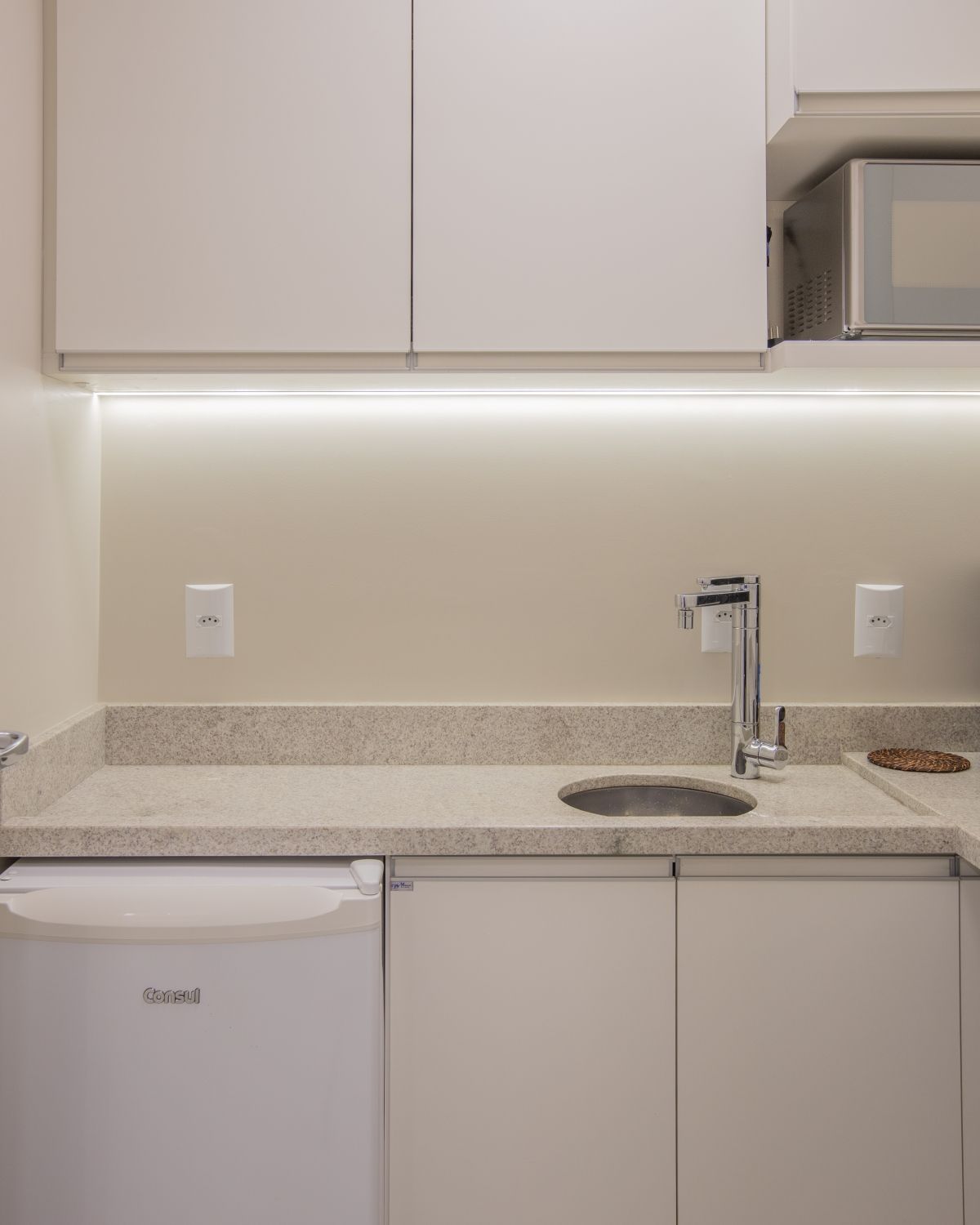 Copa e lavabo ficaram em tons claros para dar maior amplitude e facilitar a limpeza.