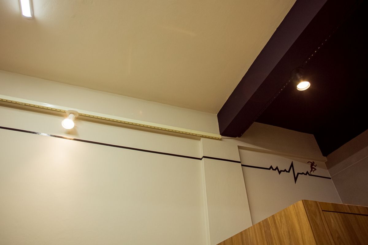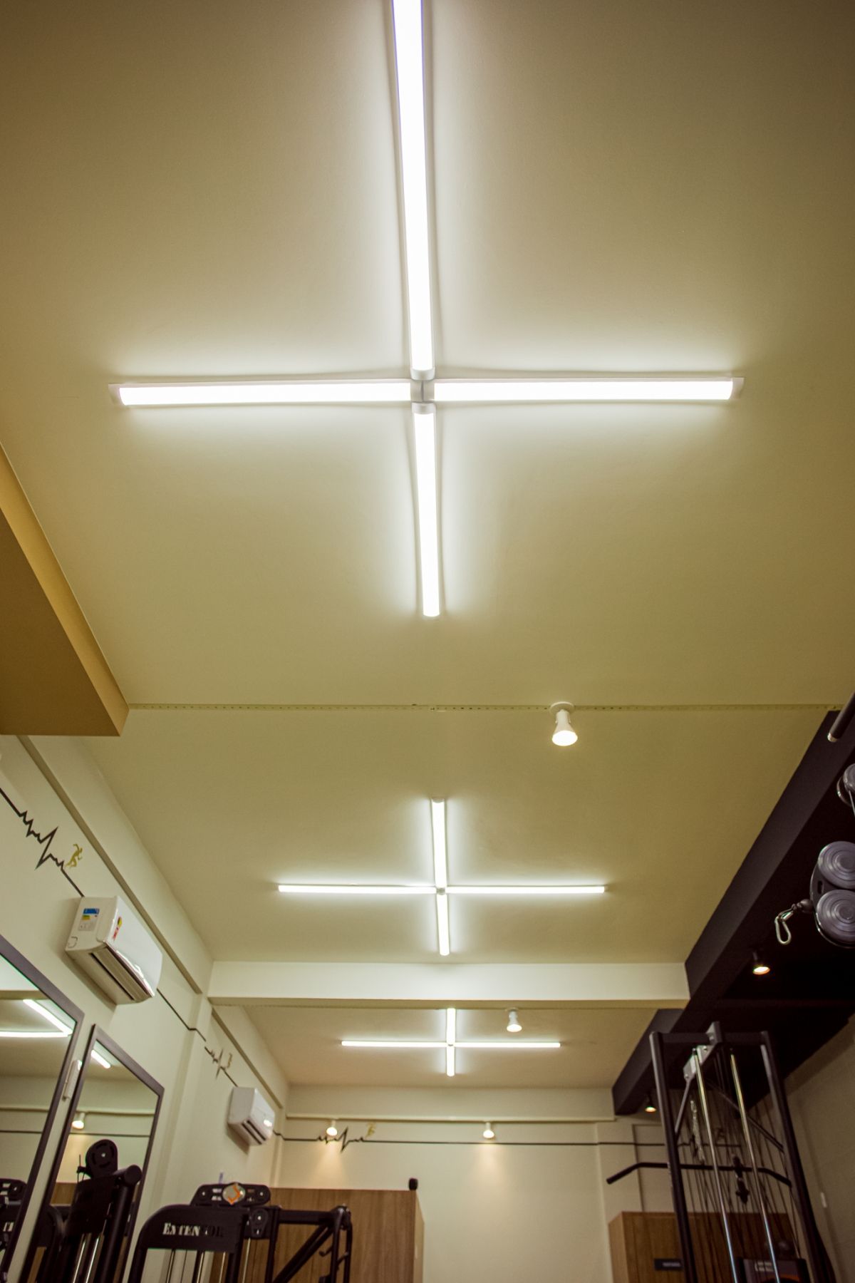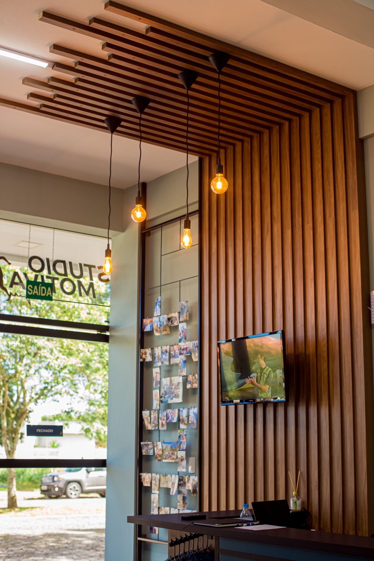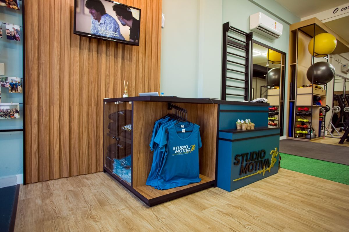 Outra questão muito importante é a identidade visual da marca, que foi muito bem explorada na comunicação visual, com os batimentos cardíacos nas paredes, promovendo a integração e continuidade entre todo o ambiente mesmo com as divisórias da sala de atendimento e vestiário.